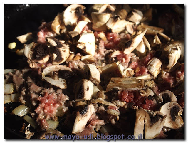 מוסיפים לבצל את הבשר הטחון, ועליו את הפיטריות