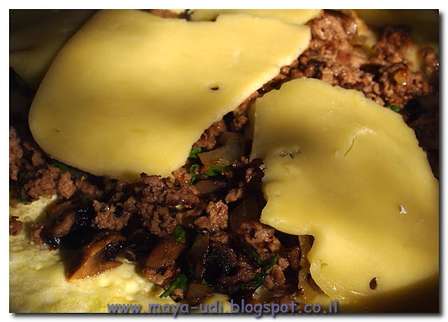 מוסיפים לבצל את הבשר הטחון, ועליו את הפיטריות